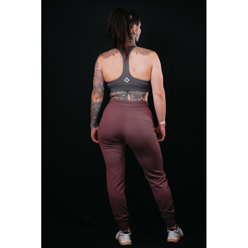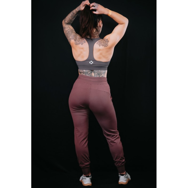 Cette brassière grise BARBARA coupe croisée avec le logo rond présent en blanc sur l'arrière de la brassière.