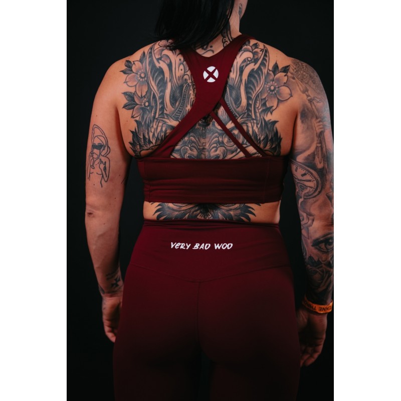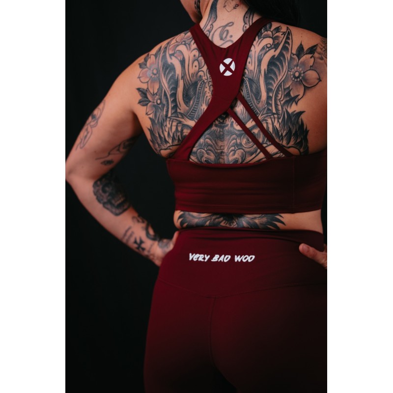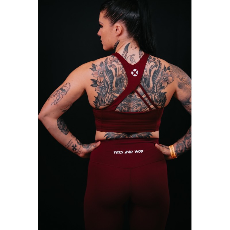 Ce top crop avec brassière intégrée rouge cardinal CHELSEA coupe high chest est très stylée. Le logo rond very bad wod est présent en noir sur l'arrière du crop bra.