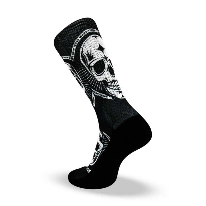 Chaussettes sport noir hautes au design original conçu en partenariat avec Northern Spirit. Dessous renforcé noir. Skull NS blanche sur l'avant et sur le dessus du pied.