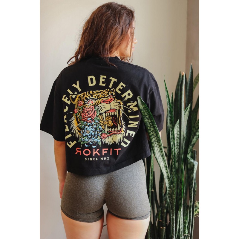 Le crop tee oversize FIERCELY DETERMINED est idéal pour les sportives cherchant le confort et le style. Design noir by RokFit.