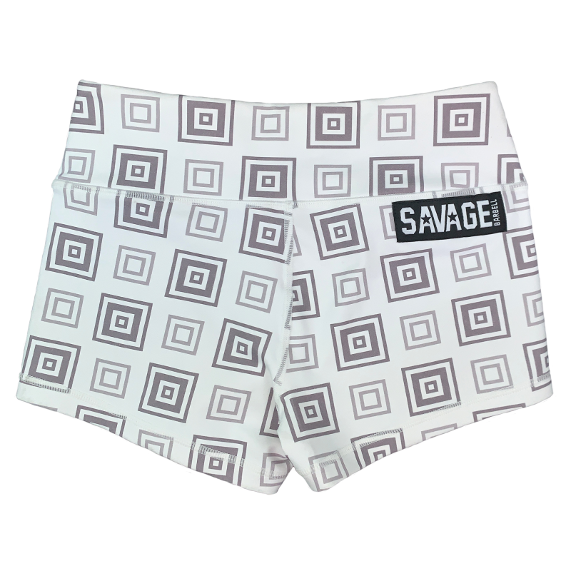 Booty short femme sport modèle blanc BOX SQUAT. Le logo Savage est présent sur l'arrière au niveau de l'élastique.