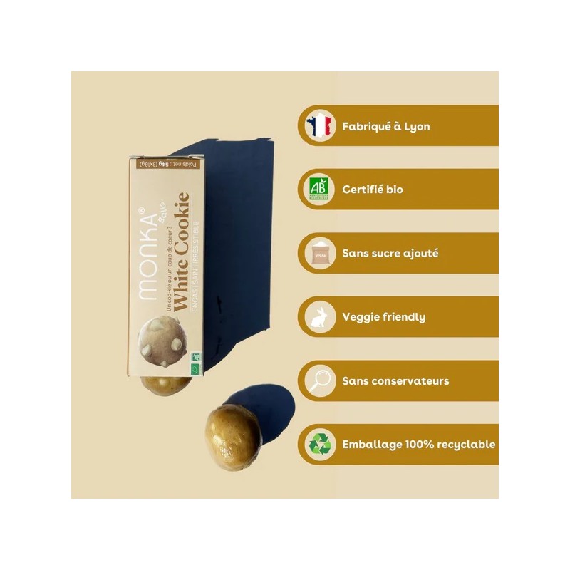Avec les Monka Balls White Cookie, vous choisissez un snack de qualité supérieure, élaboré en France pour booster vos performances tout en respectant votre bien-être. Plus qu'une simple energy ball protéinée, c'est un véritable allié de votre quotidien sportif.