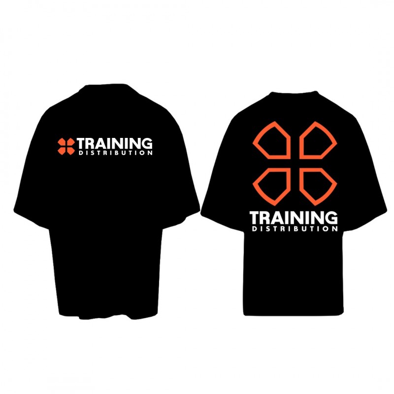 T-shirt coupe oversize unisexe de couleur noir modèle TRAINING DISTRIBUTION écriture orange et blanc