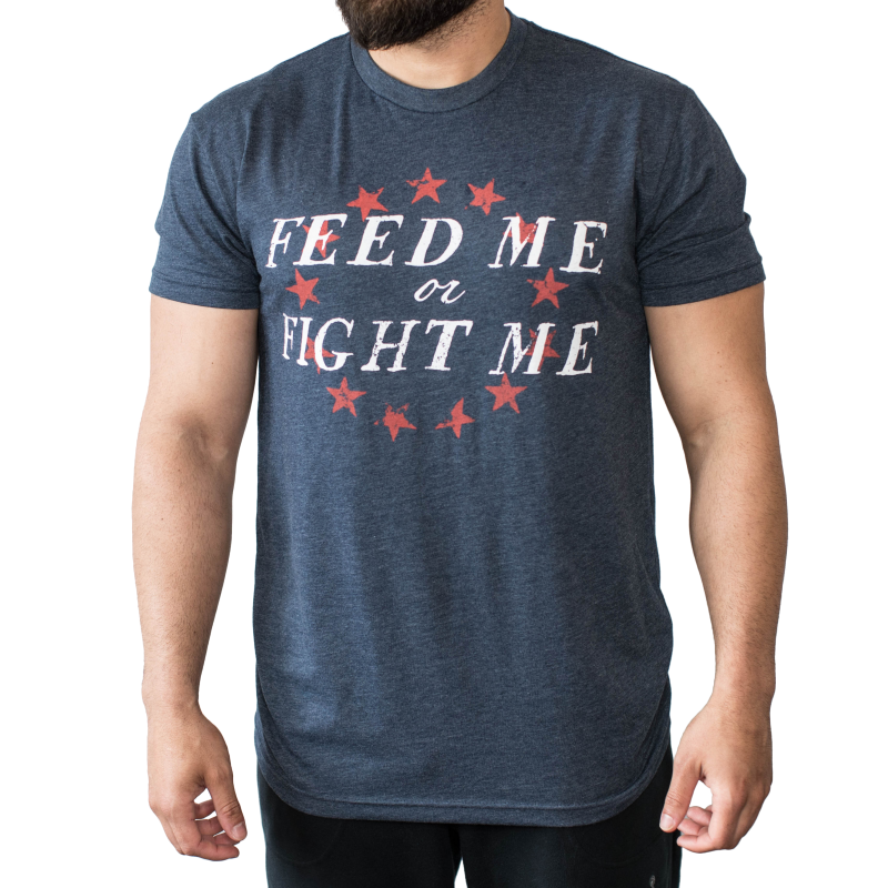 T-shirt d'entraînement pour homme modèle AMERICAN bleu. L'inscription Feed me or Fight me est présente au niveau du buste. Le débardeur est bleu et l'inscription est entourée d'étoiles rouges.