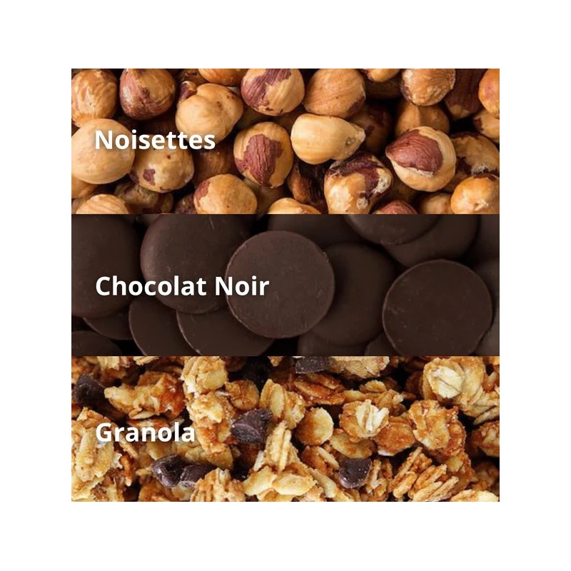 (Mixture of granola, chocolate and hazelnuts) Granola (oats, apple, rapeseed oil, coconut blossom sugar, grated coconut) Dark chocolate (cocoa mass, cane sugar, cocoa butter, vanilla extract) Hazelnuts . No added salt.