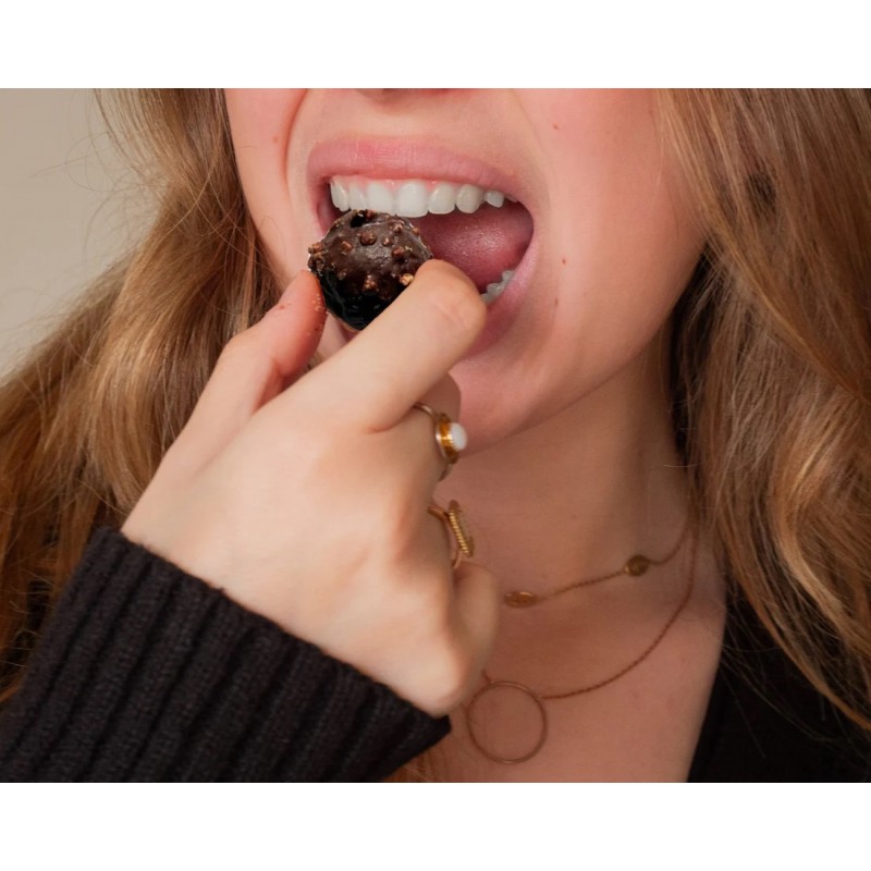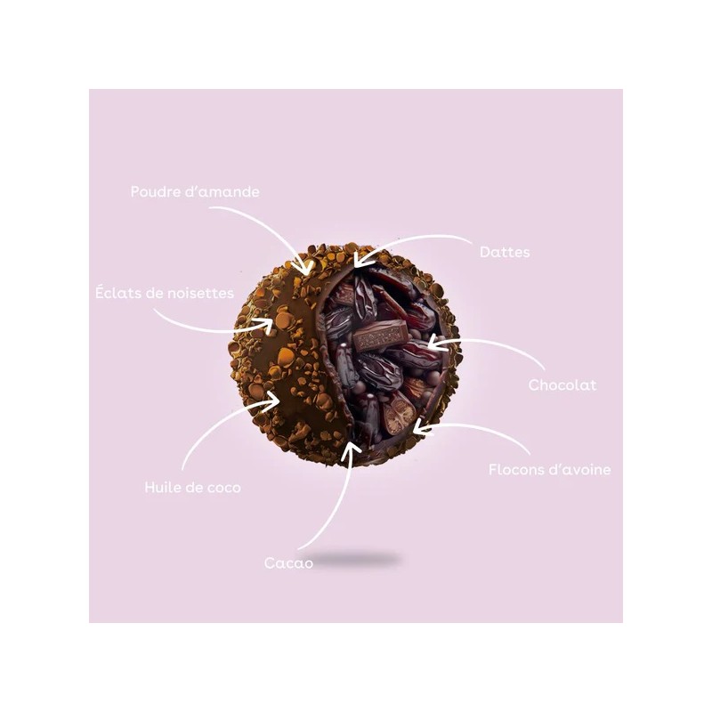 Organic ball made with dark chocolate and dates: Dates*, 50% chocolate from Peru* (cocoa mass, cane sugar, beet sugar, cocoa butter), Oat flakes*, almond powder*, Oil of coconut*, Cocoa*, Eclat de hazelnuts* (hazelnut, cane sugar), Fleur de Guérande.