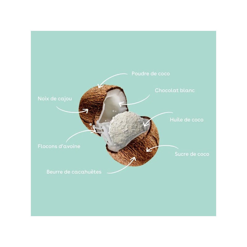 Organic ball made from coconut and peanut butter: German peanut butter*, cashew nuts*, oat flakes*, 16% coconut powder*, white chocolate (cane sugar, cocoa butter, milk powder, vanilla), 3% coconut oil*, 4% coconut sugar*.